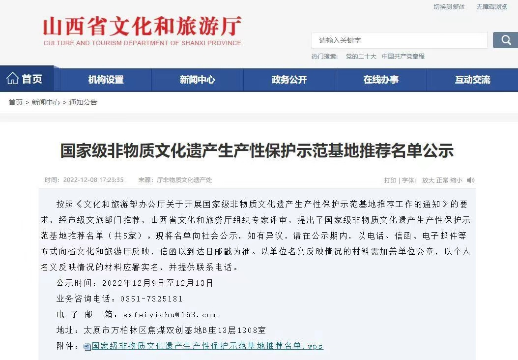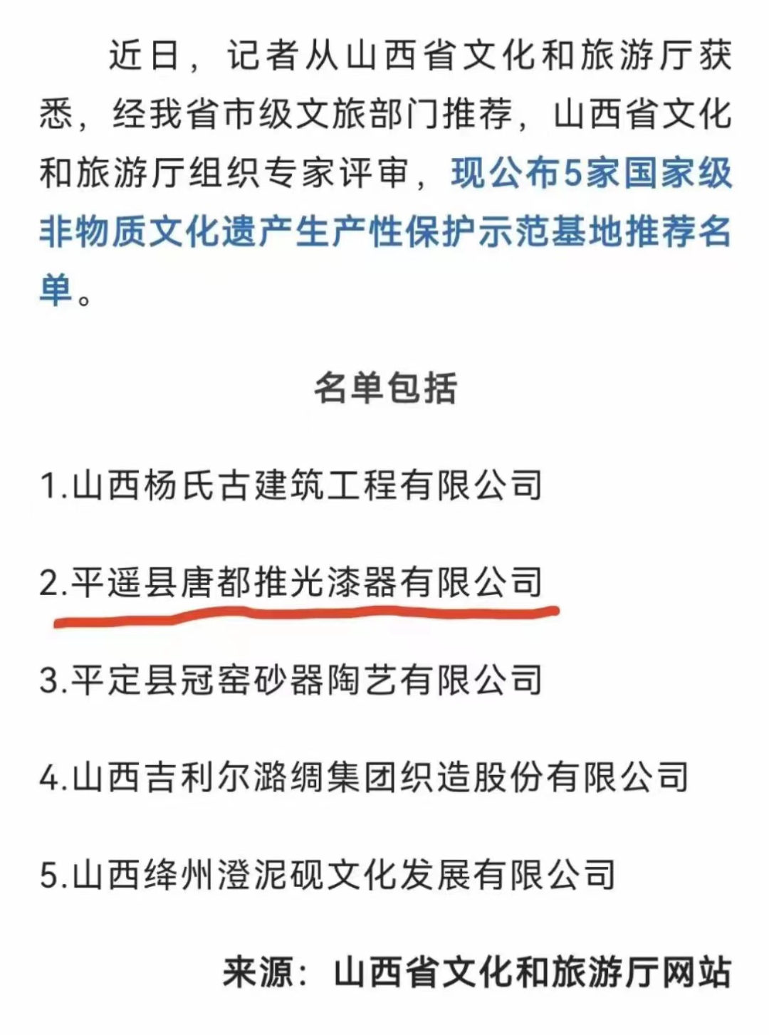 近日,根據(jù)《文化和旅游部辦公廳關(guān)于開(kāi)展國(guó)家級(jí)非物質(zhì)文化遺產(chǎn)生產(chǎn)性保護(hù)示范基地推薦工作的通知》,經(jīng)市文旅部門推薦,山西省文化和旅游廳組織專家評(píng)審,平遙唐都推光漆器有限公司入選“國(guó)家級(jí)非物質(zhì)文化遺產(chǎn)生產(chǎn)性保護(hù)示范基地”推薦名單。